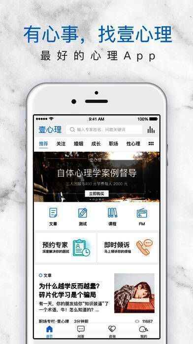 “壹心理APP”,作为国内最大的综合心理服务平台,你可以在这里阅读心理文章、进行心理测试、学习心理课程、收听心理FM、提出心理问题以及预约心理专家。国内外5000多位专业心理咨询师会为你解决生活中各类心理问题,还有千万网友在平台上免费回答你的提问,陪你一同成长!