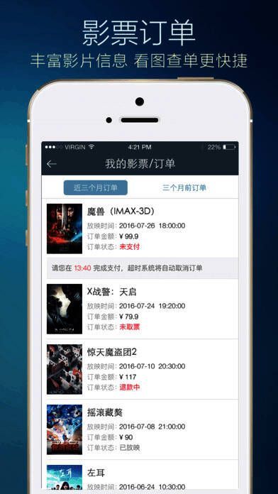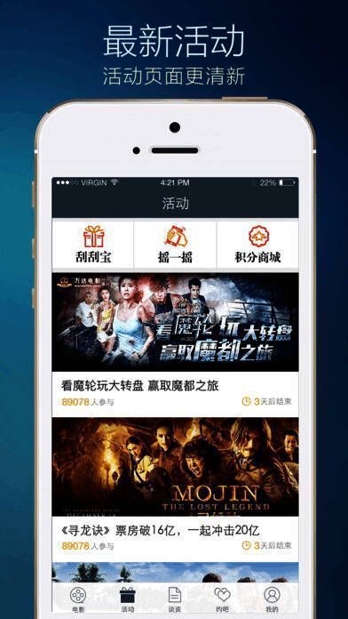 万达电影作为万达院线官方购票软件,提供全国万达影城的影片资讯和最新活动内容,全力打造集购票、娱乐、生活为一体的休闲娱乐服务平台。秉持“打造高端观影体验,服务至上”理念,伴您度过在万达影城的美好观影时光,携手万达影迷共创专属电影产品。