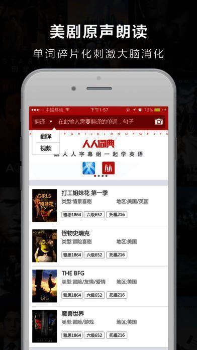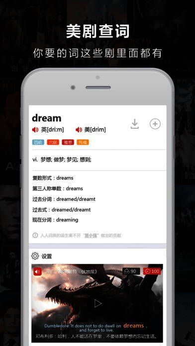 人人词典由人人字幕组与 FLVCD 合作打造,创新性地将字幕组十年积累的原创双语字幕和词典工具相结合。用户只需查询任意单词,就能得知该词在哪些电影、美剧台词中出现过,告别枯燥、千篇一律的例句。通过图文并茂的展示和电影原声,让单词记忆更加深刻。