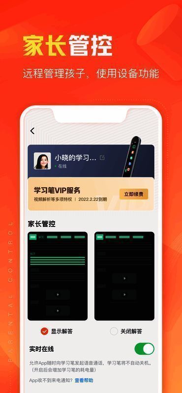家长能通过该应用程序远程管理孩子可使用的设备功能,用手机管理学习硬件,避免孩子懒惰学习和过度依赖科技产品。错题本和生词本会有效整理,让考试复习事半功倍,学习情况一目了然,便于家长了解孩子学习问题。