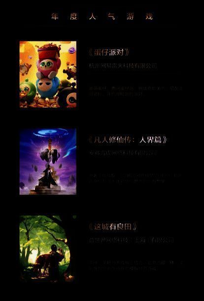 今年的榜单包括《三国志·战棋版》《星球:重启》《元梦之星》3款年度编辑推荐游戏,《凡人修仙传:人界篇》《蛋仔派对》《这城有良田》3款年度人气游戏,以及《口袋骑兵》《疯狂骑士团》《神器传说》3款年度热门快游戏,9款上榜游戏均为近两年内发布,各有千秋。