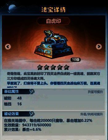 获取途径:大荒冢的法宝探索有概率探索到成品和碎片,但是由于法宝有概率性不能保证必出成品,建议可以在另外一个获取途径商店-超值礼包直接购买白虎印成品