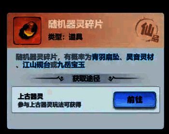 ①器灵:可通过上古器灵活动随机产出,活动结束亦可在宗门拍卖行进行拍卖获得,器灵试炼也可以获得