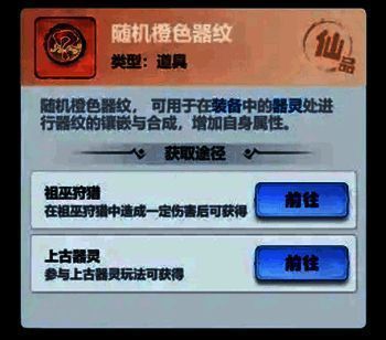 ②器纹:在上古器灵和祖巫狩猎副本中均可获得,也可以通过拍卖行获得