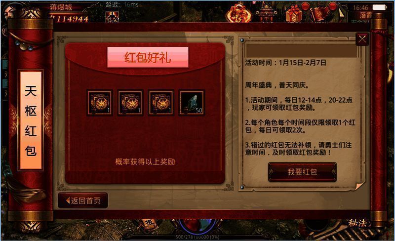 活动期间,每日12-14、20-22点都可前往中州NPC处领取整点红包,打开红包必定获得奖励,有几率额外获得极品奖励,极品奖励传出还会有全服飘黄哦!与此同时,还将推出全服限定奖池,本服所有玩家一起赢取限量升星称号碎片,数量有限、先到先得!