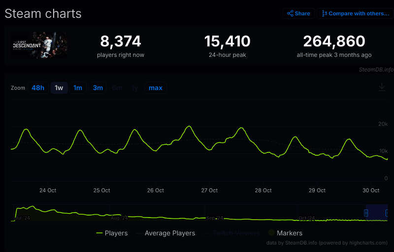这些好看的角色设计以及这种倾听玩家诉求的官方,自然获得了许多的支持。虽然游戏在 Steam 上没有刚发售时的26 万人同时在线,但现在仍然有着平均上万人每天同时在线的热度。