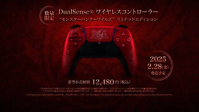 限定版DualSense控制器以火山红为底色,两侧饰以游戏初期猎人装备图案的精致银色设计。触控板则印有禁足地调查队的标志。,官方建议零售价为12,480日元(含税)。 型号为CFI-ZCT1JZ5。