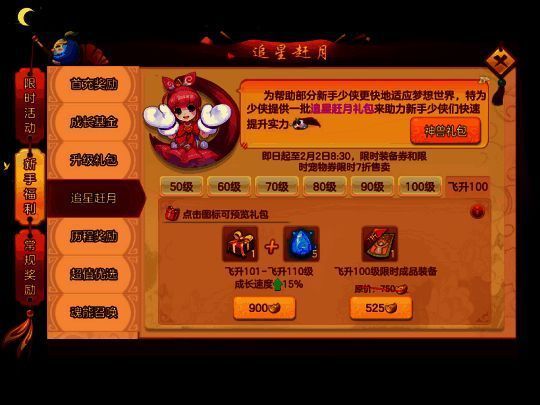 1)春节追星赶月优惠活动:装备、宠物租赁券限时折扣出售,并新增飞升100级装备租赁券等。