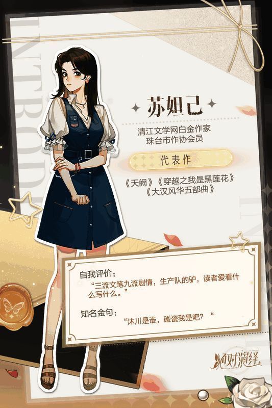节目的导师也是这个节目的超大看点,考验艺人玩家的,是四位拥有超高名气和知名度的导演、演员,和作家。苏妲己,清江文学网白金作家。她的《大汉风华》系列开创了清江文学网穿越文新流派,同名电视剧收视率双台年冠。《天阙》全本vip收益破清江网记录,实体书翻译成多国语言畅销海外。