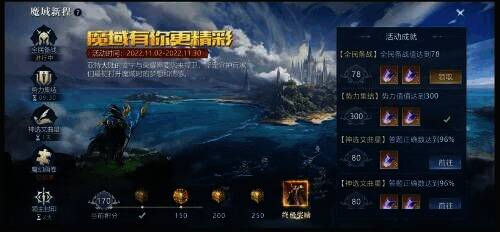 4、「神选文曲星」:每日进行魔域知识问答,根据答题正确数量领取里程碑奖励。回答正确率与回答速度将会影响总体排名,活动结束后将额外发放排名奖励。