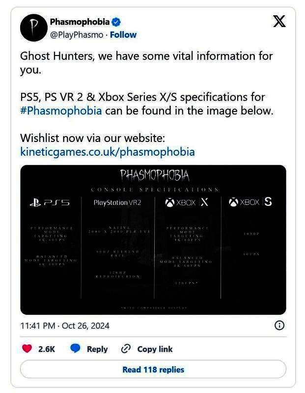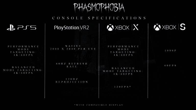 在Xbox Series S上,《恐鬼症》将以1080p和60FPS运行,没有其他图形模式可供选择。最后,在PlayStation VR2上,游戏将以单眼2000×2400原始分辨率运行,刷新率为60Hz,重投影率为120Hz。