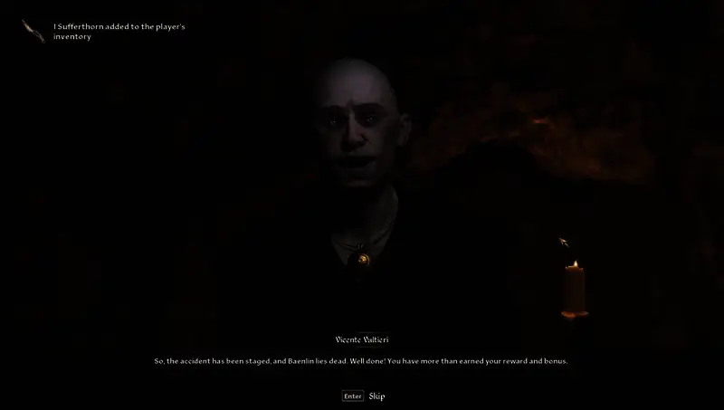 向Vicente Valtieri汇报完成合同,获得奖励和成就。