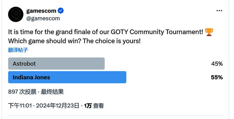 根据科隆官推,最终入围的两大游戏是《宇宙机器人》和《夺宝奇兵:古老之圈》,二者的得票率45% vs 55%,《夺宝奇兵》领先了10%。