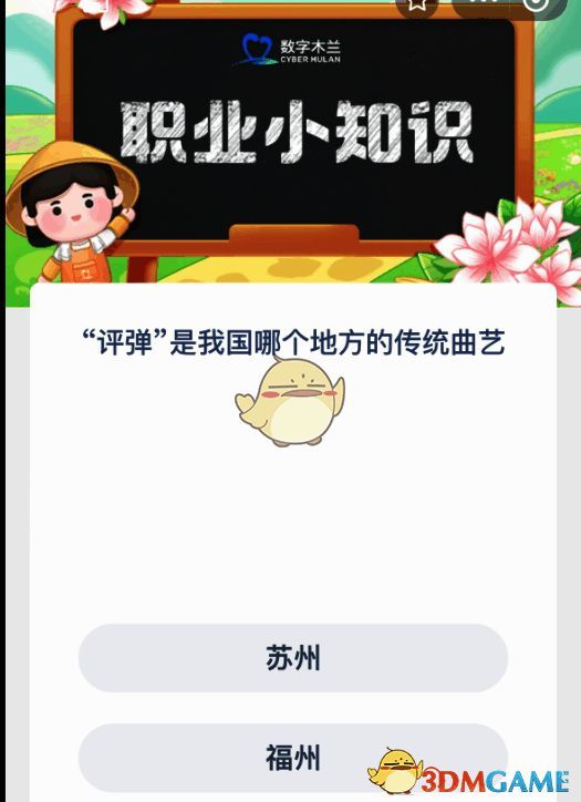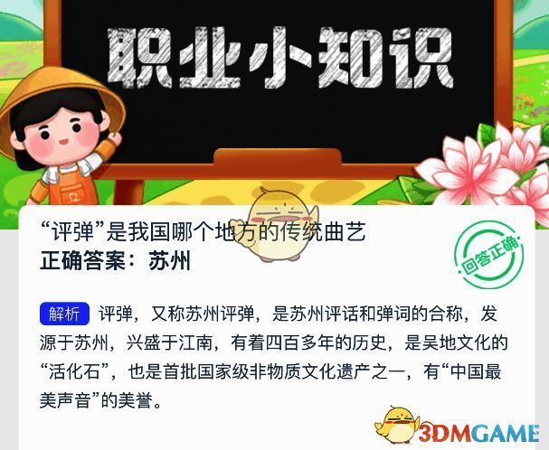 “评弹”是我国哪个地方的传统曲艺?这是支付宝蚂蚁新村2025年2月24日题目,蚂蚁新村每天都有新的职业小知识课堂题目,大家找到【加速产币】图标,点开后选择【职业小知识问答】对话框,点击右侧【去完成】按钮,即可看到当天的蚂蚁新村问题。今日答案是【苏州】。评弹,又称苏州评弹,是苏州评话和弹词的合称,发源于苏州,兴盛于江南。