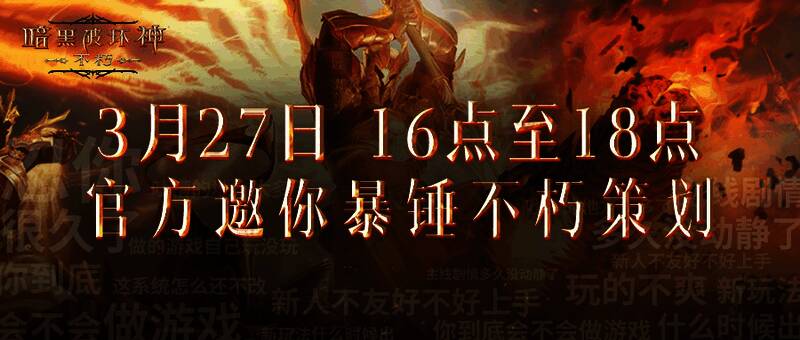 不朽策划在线“被锤”,爆笑喜剧轮番上演!3月22日,《暗黑破坏神:不朽》官方邀请玩家投票,决定自己想“暴打”的策划人选。最终得票最高的数值策划和战斗策划成功当选,充当玩家的“出气沙包”,3月27日16点至18点,两位策划在威斯特玛训练场高调应战,拉开玩家和策划PK单挑的序幕。