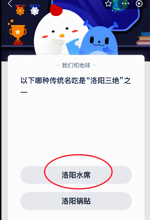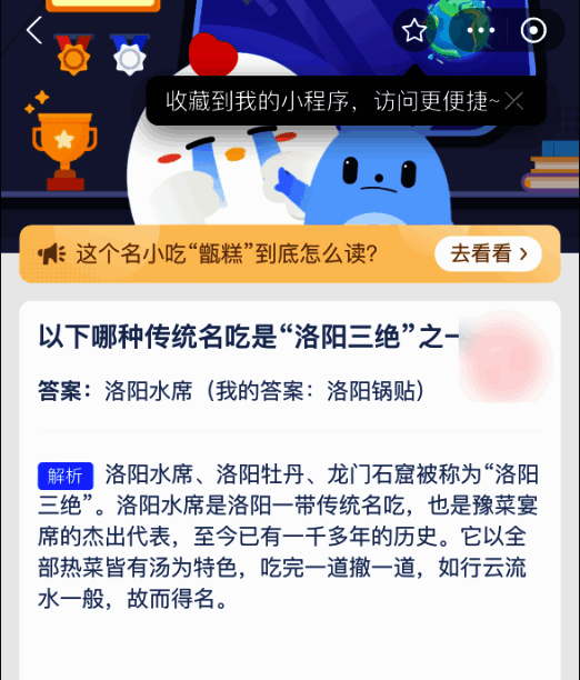 以下哪种传统名吃是“洛阳三绝”之一?这是支付宝蚂蚁庄园每日题目,蚂蚁庄园完成每日最新的题目可以获得180g饲料。我们可以用饲料喂养小鸡。支付宝蚂蚁庄园2025年2月24日题目答案是【洛阳水席】。水席是洛阳一带特色的传统名宴,与龙门石窟、洛阳牡丹并称“洛阳三绝”。
