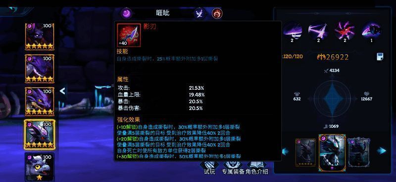 皎月刺客睚眦站桩打工会boss很强而且主线依靠和队友行动增加怒气的敖丙令敖丙能够第一回合释放大招。40%概率在敌方行动后进行反击(自身不增加怒气,敌方会增加怒气容易搞乱节奏,因此基本和敖丙组队打脆皮队伍,不适合高等级的一队)。普攻一层撕裂,专武概率多附加一层撕裂,自身死亡使敌方所有单位获得2层撕裂,2技能5层撕裂立即结算撕裂伤害和360%攻击的额外伤害。睚眦需要和敖丙配合,组成自爆队,炸死二队低等级野怪。
