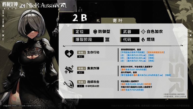 2B作为本次联动的主要角色,不仅有防御型妮姬的坦度,配队得当的时候还有相当可观的伤害,她的独特机制还能让指挥官在个人突击和联盟战等特定环境中多一张对策卡,在新指挥官初见开荒和老指挥官攻克高难时都能派上用场。