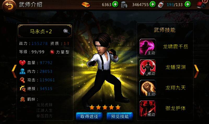 - **真人实时对战,用功夫征服他(她)**:游戏拥有真人同屏联机对战功能。数十位功夫明星分为力量、防御、速度、持武四种类型,相互循环克制。玩家在PVP过程中,不仅需要技巧,在安排出战武师时还需具备一定的策略思考。可与好友相约一场功夫对决,用实力一决胜负。