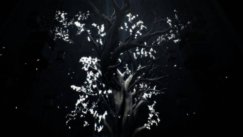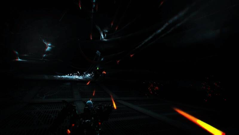 场景中利用光影切割空间层次,如透过装甲缝隙的斜射光线,烘托出压抑与神秘交织的废墟氛围。