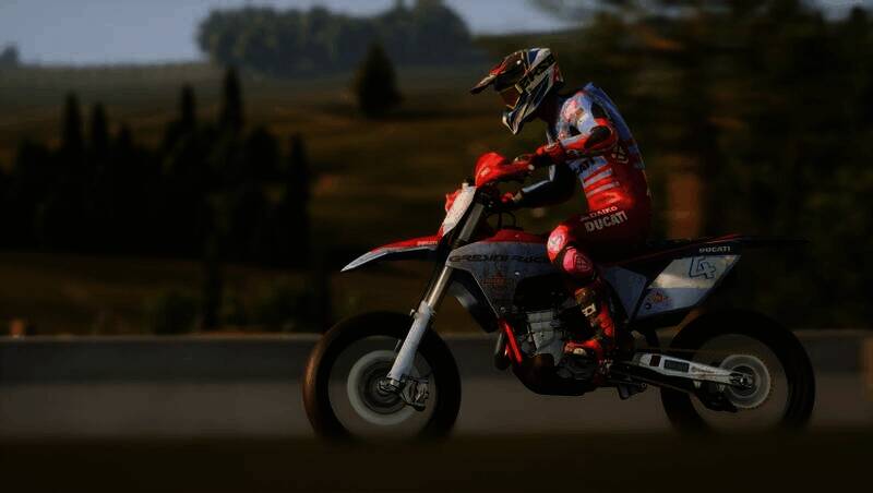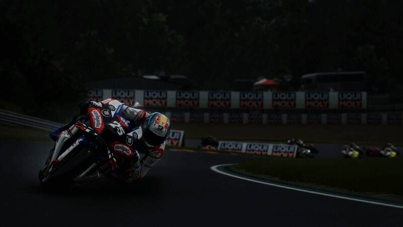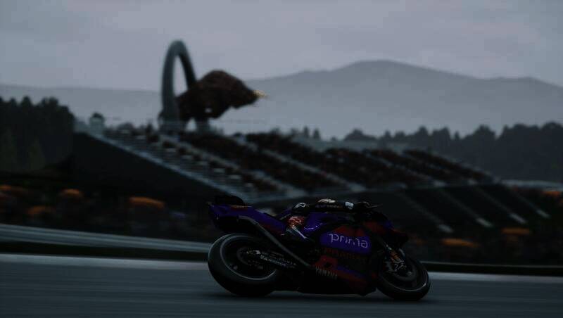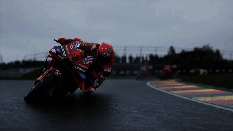赛道上的沙粒、雨水溅射效果,以及摩托车金属材质的反光都以高精度呈现。