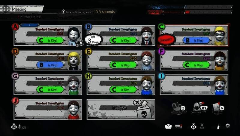 全体玩家一起讨论可疑行为并投票处决嫌疑人。要是基拉身份被识破,L阵营获胜;若基拉成功击杀L或者完成进度条任务,基拉阵营获胜。游戏中有四大角色,分别是基拉(主谋)、追随者(协助转移笔记)、L(指挥全局)、调查员(执行搜查),各角色技能和任务差异明显,比如追随者能短暂伪装成平民混淆视听,L可通过全局视角标记高危目标。