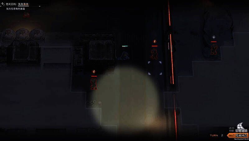 游戏的潜行机制由敌方与玩家角色视野、地形差异、天气系统等要素共同构成。玩家需要根据自身暴露在敌方视野中的时机,制定相应的行动策略。游戏中还设计了许多“视野陷阱”,部分关卡甚至以潜行为主要目标,玩家不能盲目冲锋,否则容易陷入困境。