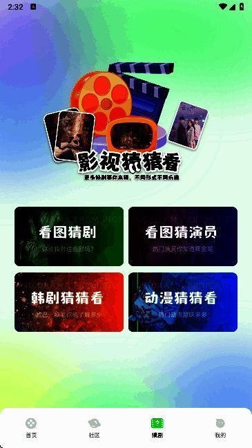 用户打开软件可看到丰富影视作品。影视社区能提供影视信息。软件还有看图猜剧猜演员的趣味玩法,可检测用户影视储备量。