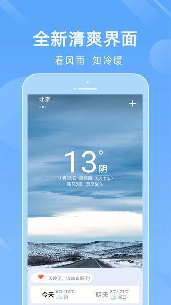 这款软件有个性化天气界面,用户可自由设置主题与语音提醒,播放异常天气状况,做好防护,还能分享天气变化。
