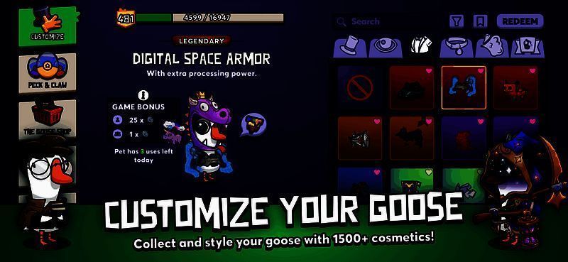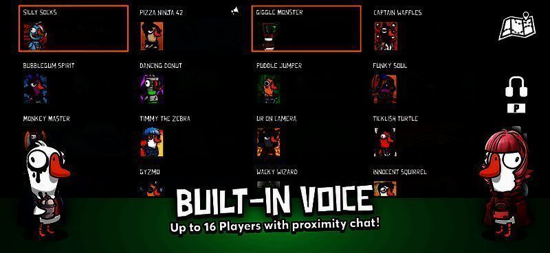 目前游戏拥有六种模式,分别为经典版、经典强化版(拥有更多角色)、猎鹅(一只鸭在时间内杀死所有鹅)、霸王餐、不给糖就捣蛋,最后一个是专门用于交朋友聊天的模式。