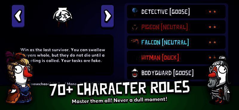首先从角色说起,作为家禽界的狼人杀,游戏出场角色大多是家禽,大致分为鹅、鸭子、呆呆鸟、秃鹫、鸽子、猎鹰六类,各类角色的获胜条件各不相同,下面详细介绍。