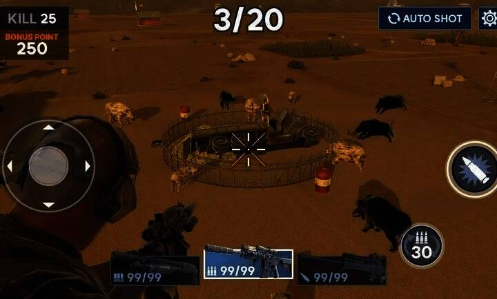 1、玩家在飞行的直升机上进行紧张刺激的狩猎,精准打击移动的野猪。
