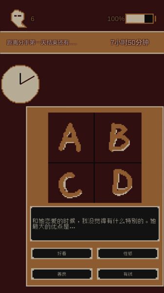 《刚分手的24小时正版》是一款看似随机却极为真实的文字冒险模拟游戏。游戏以分手为背景,玩家要扮演刚分手的男人,在24小时内体验各种心理状态,感受分手带来的不同情绪。玩家需摆脱分手烦恼,选择不同项目让角色开心,同时要承担选择带来的后果。