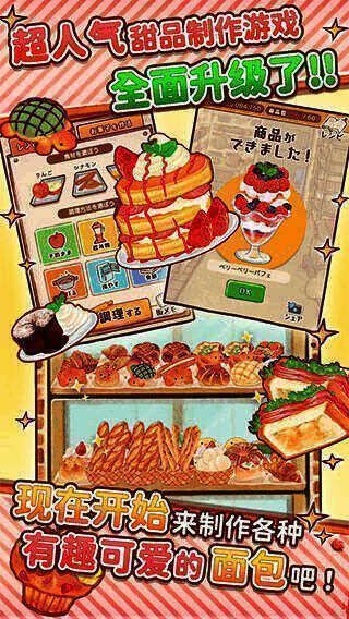 玩家能制作多种口味面包宣传店铺,提升口碑。游戏画面可爱,氛围舒适,可解锁众多洋果子制作方法,让顾客爱上这里的食物,实现商业梦想,让店铺兴旺。