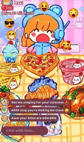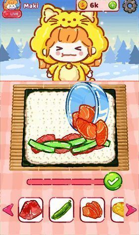 进入游戏后点击“Start Live”开启直播,观众会提出寿司制作要求,比如不要加黄瓜。制作过程中每个步骤都有进度条,满格代表完成。在竹子上依次放入海苔、饭团,按要求添加馅料,自动卷起来后滑动屏幕均匀切开,最后撒上调料,美味寿司就制作完成了。将寿司移到角色嘴边让其食用,完成直播即可获得奖励。
