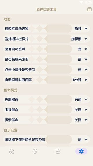 原神口袋工具是一款专门为原神玩家打造的掌上应用。玩家通过它能实时查看原粹树脂、洞天宝钱等数据信息,还能进行抽卡分析,判断自己是欧皇还是非酋。其桌面小部件功能可让玩家通过桌面组件显示签到时间、半价周本等核心信息。