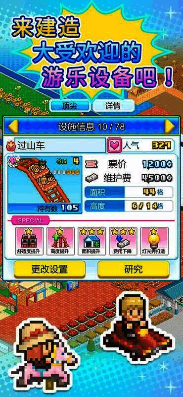 随着游乐园等级提升,会解锁更多新设施,部分游乐项目放置后可扩建延伸轨道或路径,还能通过研究提高等级,增强游乐体验。