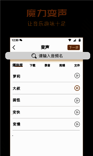 4、进入变声页面,可输入音频名查找,也可试听萝莉、大叔、搞怪等声效。