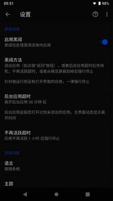 【即时响应】待机超时或从多任务窗口划掉时,黑阈会立刻强行停止黑阈清单中的应用。