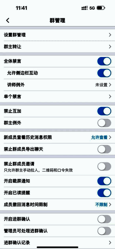4、支持单聊和群聊,群聊功能丰富,可进行禁言、加入群精华等操作。