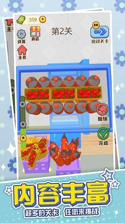4、丰富的任务系统和挑战模式,随着关卡的提升,玩家可以解锁更多复杂的收纳任务,提升游戏的耐玩性。