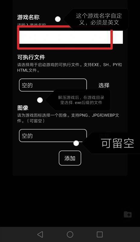 2、点击文件夹后会弹出界面,其中name可随意填写,executable file点击CHOOSE选择安卓游戏的game.exe文件,Icon可忽略或选择喜欢的图片,点击ADD完成添加。