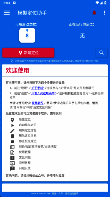 软件基于 Android 系统的模拟定位功能,通过显示地图,可将指定位置转换成经纬度并临时写入模拟定位数据。功能简单,可随时开启或关闭模拟定位,旨在帮助部分用户保护位置隐私,或供安卓开发者测试手机位置切换功能。