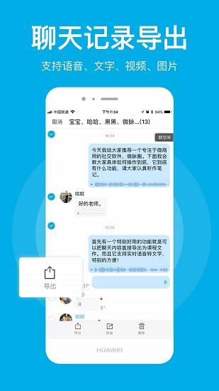 4、记录导出:点击“导出”,选择聊天的语音和文字,可存储并随意分享。