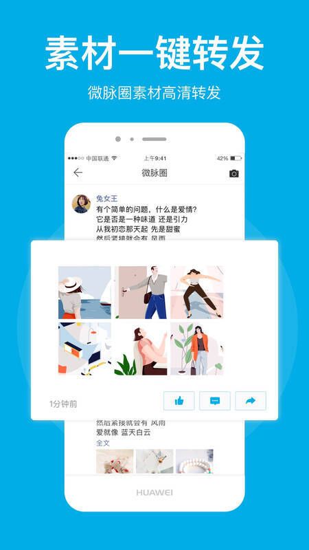 3、素材转发:进入“微脉圈”,选择好友动态转发,朋友圈立即更新。
