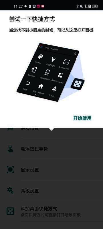 可设置屏幕亮度、音量、蓝牙、WiFi、移动网络、自动旋转等快捷键,支持小白点手势自定义功能。还能一键清理内存和缓存,把常用的设置为常用。