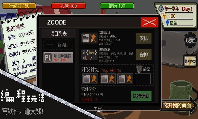 进入游戏,首先看到的是宿舍桌子,左侧显示自身属性,桌上有“我的电脑”“安排学习”“我的手机”等物品。