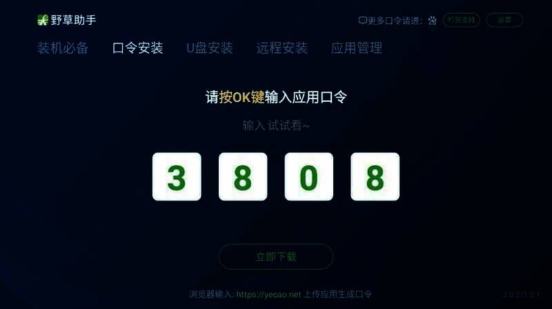 3、按遥控器数字键无法输入口令。请打开野草助手的口令安装页面,直接按遥控器OK键,页面下方会弹出键盘,请在这个键盘上左右移动选择数字或字母。野草不支持遥控器上直接按数字键。