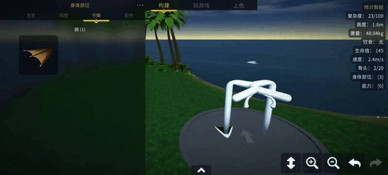 3、点击构建,玩家可以根据身体部位零件自行塑造生物,比如添加眼睛后,地图视图会更清晰。