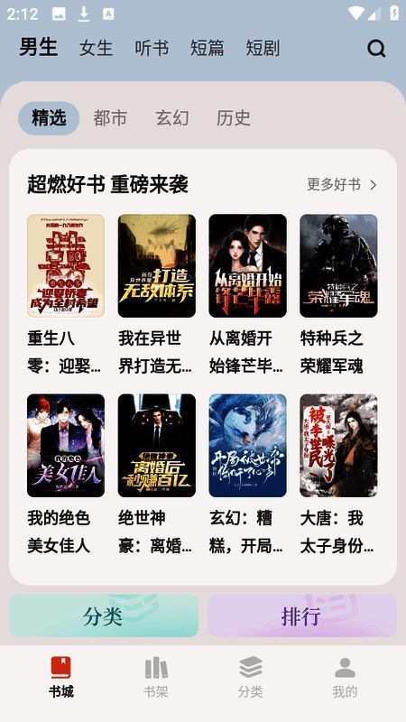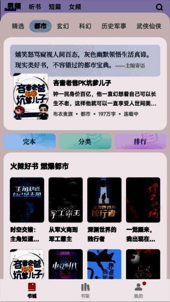 2、首页涵盖了精选、都市、玄幻、历史等题材的小说。